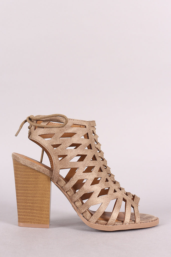 These ankle booties features a laser cut lattice weave construction, open toe front, counter cutout to a self-tie lace-up back, chunky heel and lightly cushioned insole.